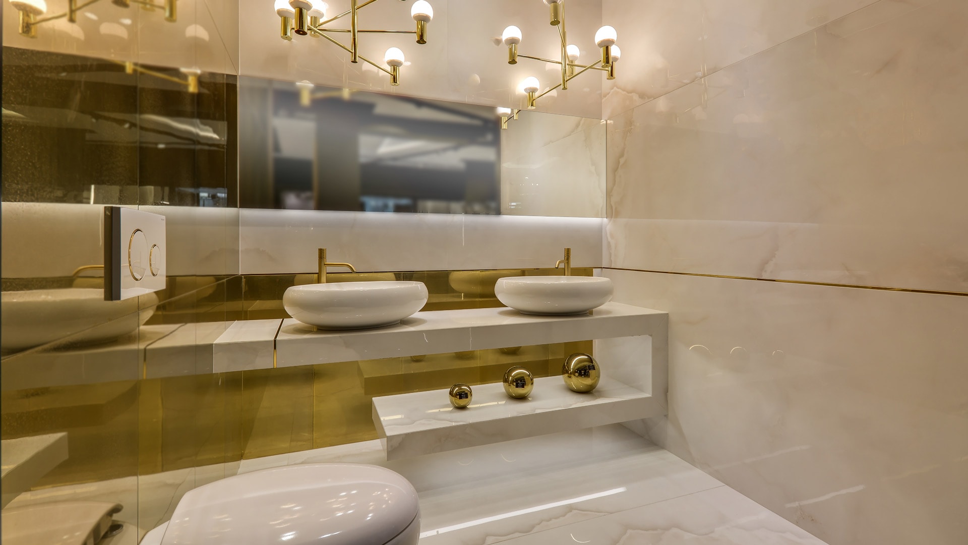 Złota łazienka w stylu glamour - oświetlenie i dekoracje