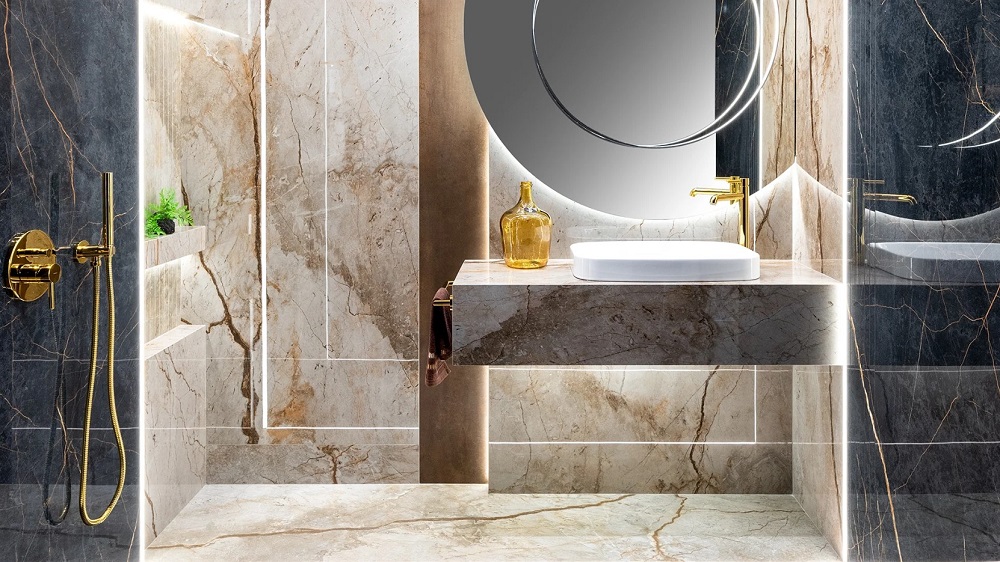 Wybierając płytki ścienne, warto rozważyć płytki imitujące marmur, który doskonale komponuje się ze złotem i podkreśla luksus wnętrza. Popularnym rozwiązaniem są także płytki z połyskiem, które odbijają światło, podkreślając elegancję aranżacji łazienki. Lustrzane powierzchnie i szklane dodatki wprowadzają lekkość i refleksyjność, co optycznie powiększa łazienkę.