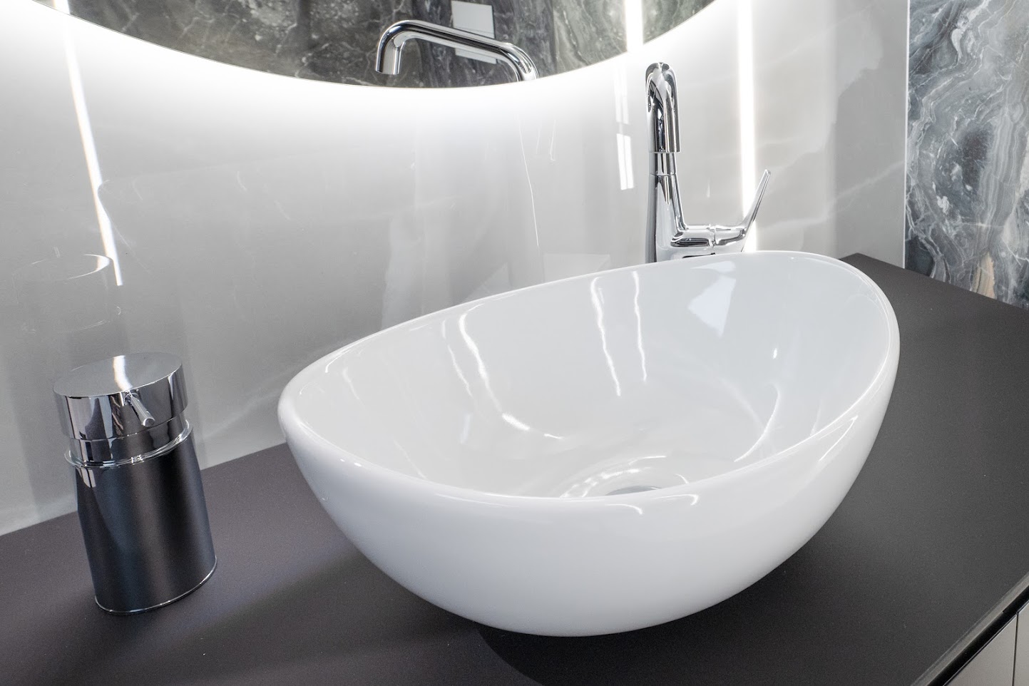 Nowoczesna umywalka nablatowa o delikatnie organicznym, asymetrycznym kształcie staje się subtelną ozdobą tej eleganckiej łazienki. Jej śnieżnobiała, gładka powierzchnia kontrastuje z ciemnym blatem, tworząc wyrazisty i jednocześnie harmonijny duet. Wysoka, chromowana bateria o lekkiej linii dopełnia całości, dodając przestrzeni lekkości i blasku. Tło stanowi jasna, połyskująca płytka ścienna, idealnie współgrająca z okrągłym lustrem z delikatnym podświetleniem LED, które nadaje wnętrzu nastrojowy, nowoczesny klimat. Każdy detal – od formy ceramiki po wykończenie armatury – został dobrany z myślą o funkcjonalności i wysmakowanej estetyce.