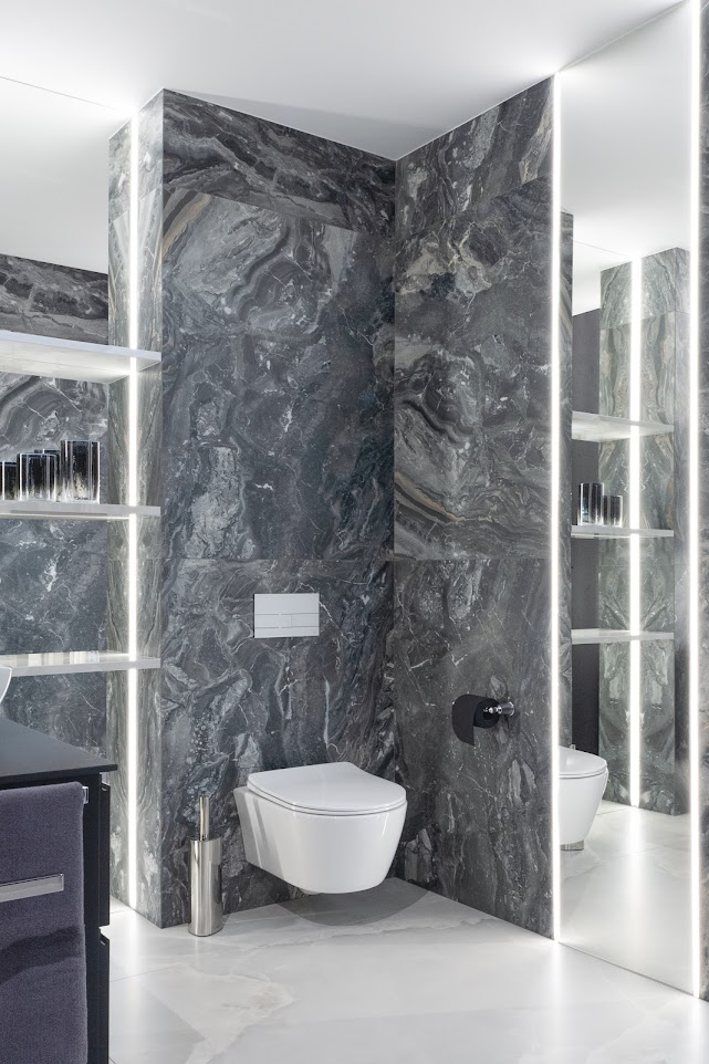 Wisząca miska WC stanowi centralny punkt tej eleganckiej aranżacji, perfekcyjnie wpisując się w kompozycję z wielkoformatowymi płytkami o wyrazistej strukturze kamienia. Jej opływowy kształt kontrastuje z dynamicznym rysunkiem ściany, a zarazem harmonizuje z miękkim odbiciem światła w wysokim lustrze i pionowym podświetleniem LED. Całość tworzy spójną, minimalistyczną przestrzeń, w której każdy element – od ceramiki po wykończenie – ma swoje wyważone miejsce.